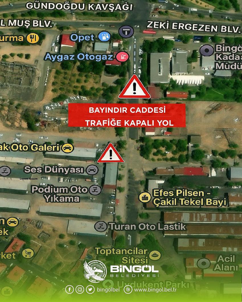 Bingöl Belediyesi tarafından yapılan duyuruda, Yeni İtfaiye Hizmet Binası ve Afet Koordinasyon Merkezi, Arama Kurtarma Hizmet Binası'nın altyapı çalışmaları kapsamında, (Bayındırlık Caddesi'nin 3 gün süre ile trafiğe kapatılacağı duyuruldu.